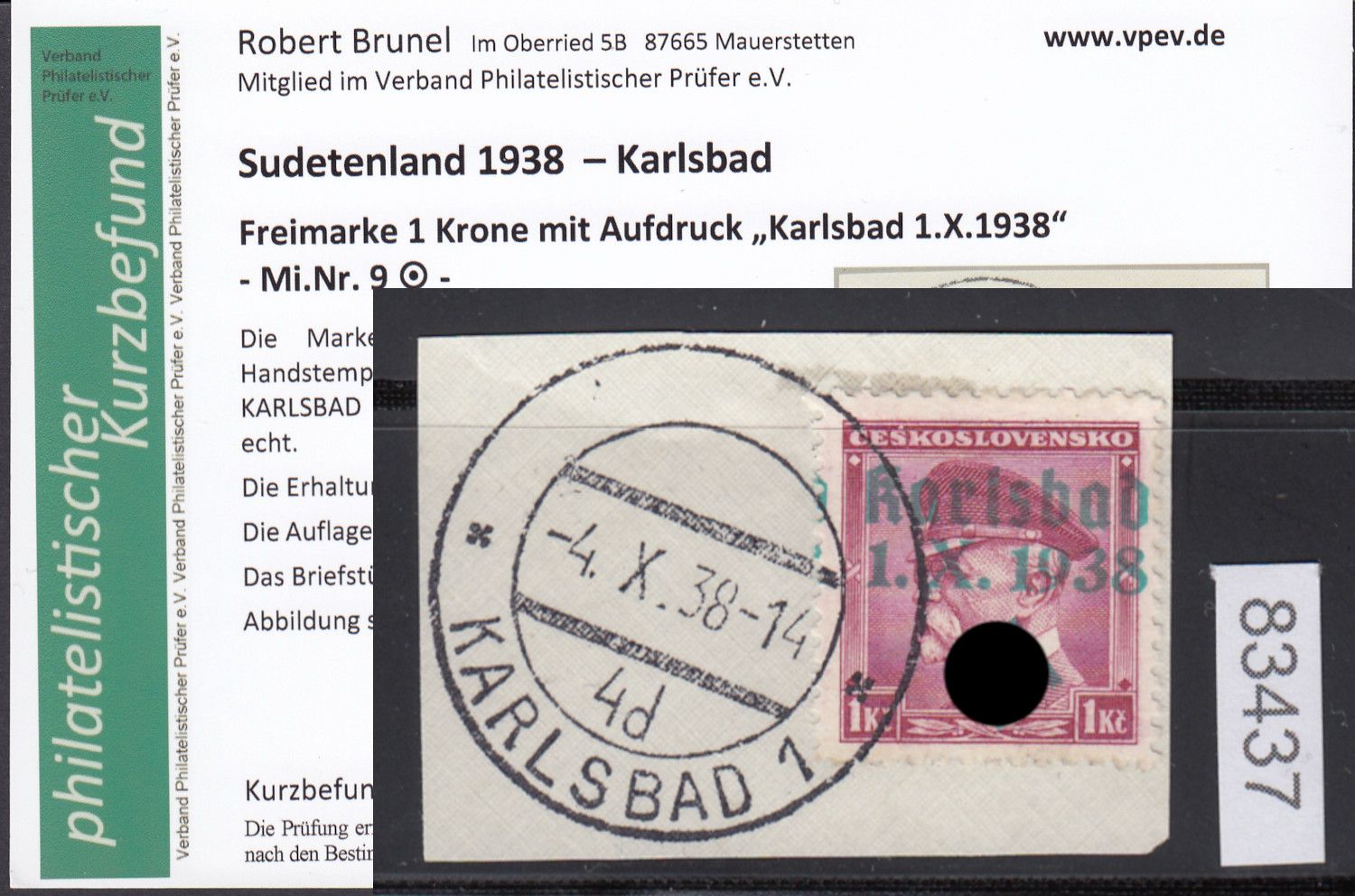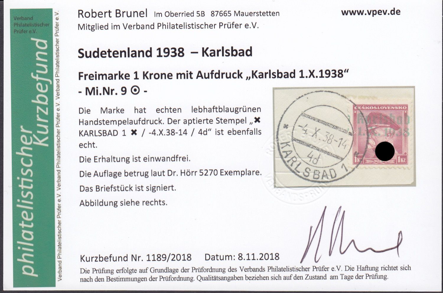 Sudetenland Karlsbad, Mi.-Nr.   9  gestempelt  geprüft  Befund