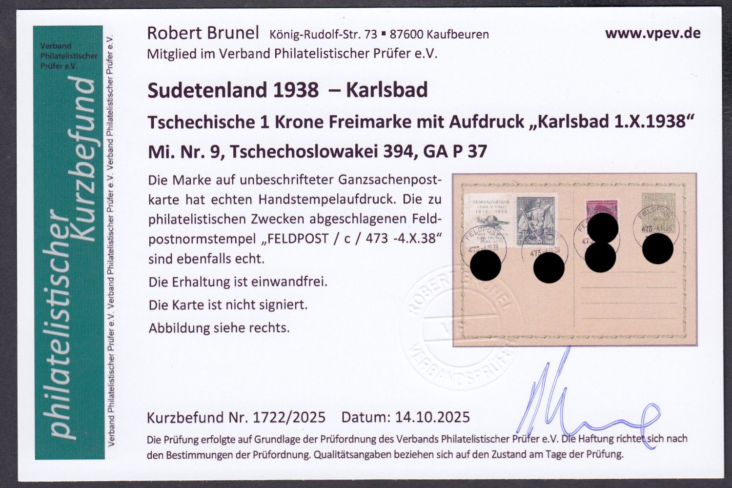 Sudetenland Karlsbad, Mi.-Nr.   9  gestempelt  geprüft  Befund