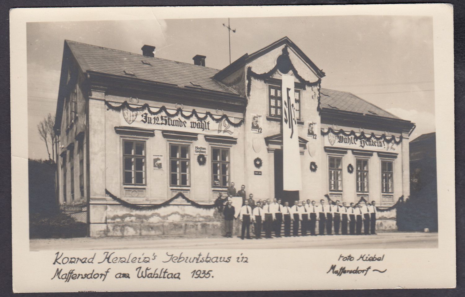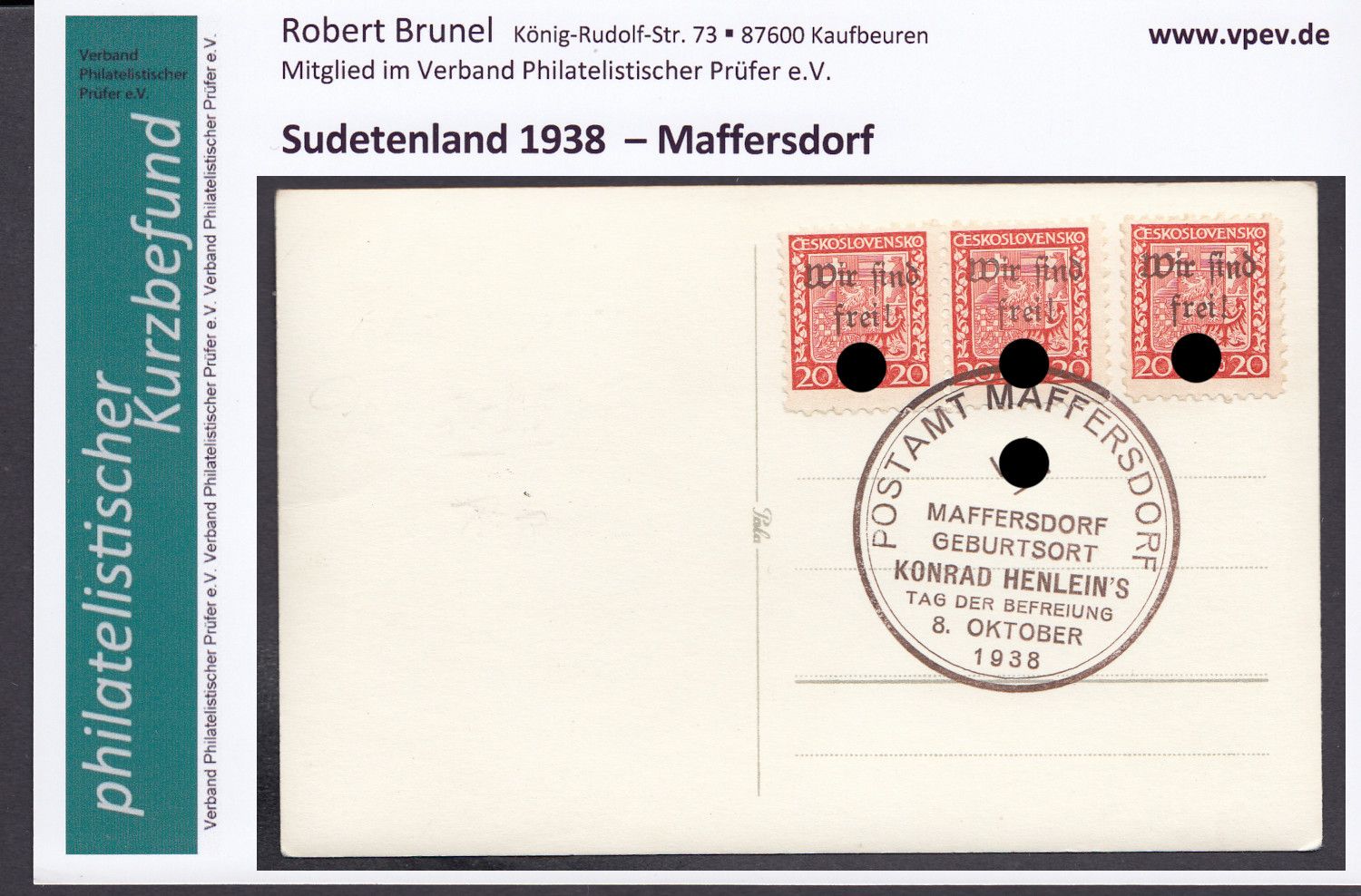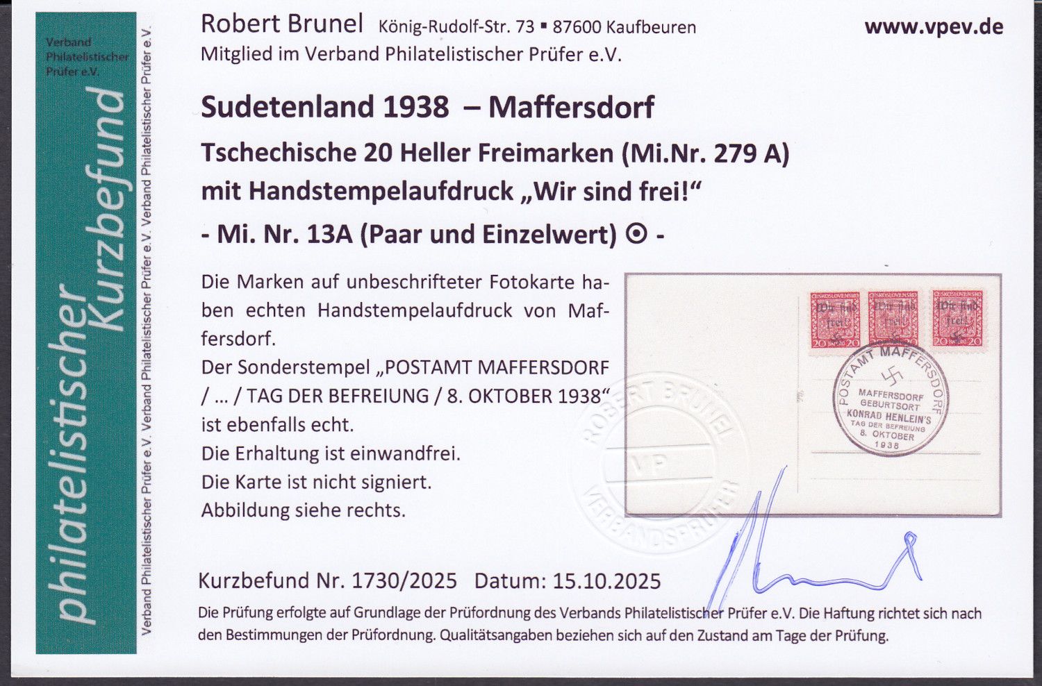 Sudetenland Maffersdorf, Mi.-Nr.   13 a  gestempelt  geprüft   Befund  auf  AK   Maffersd.