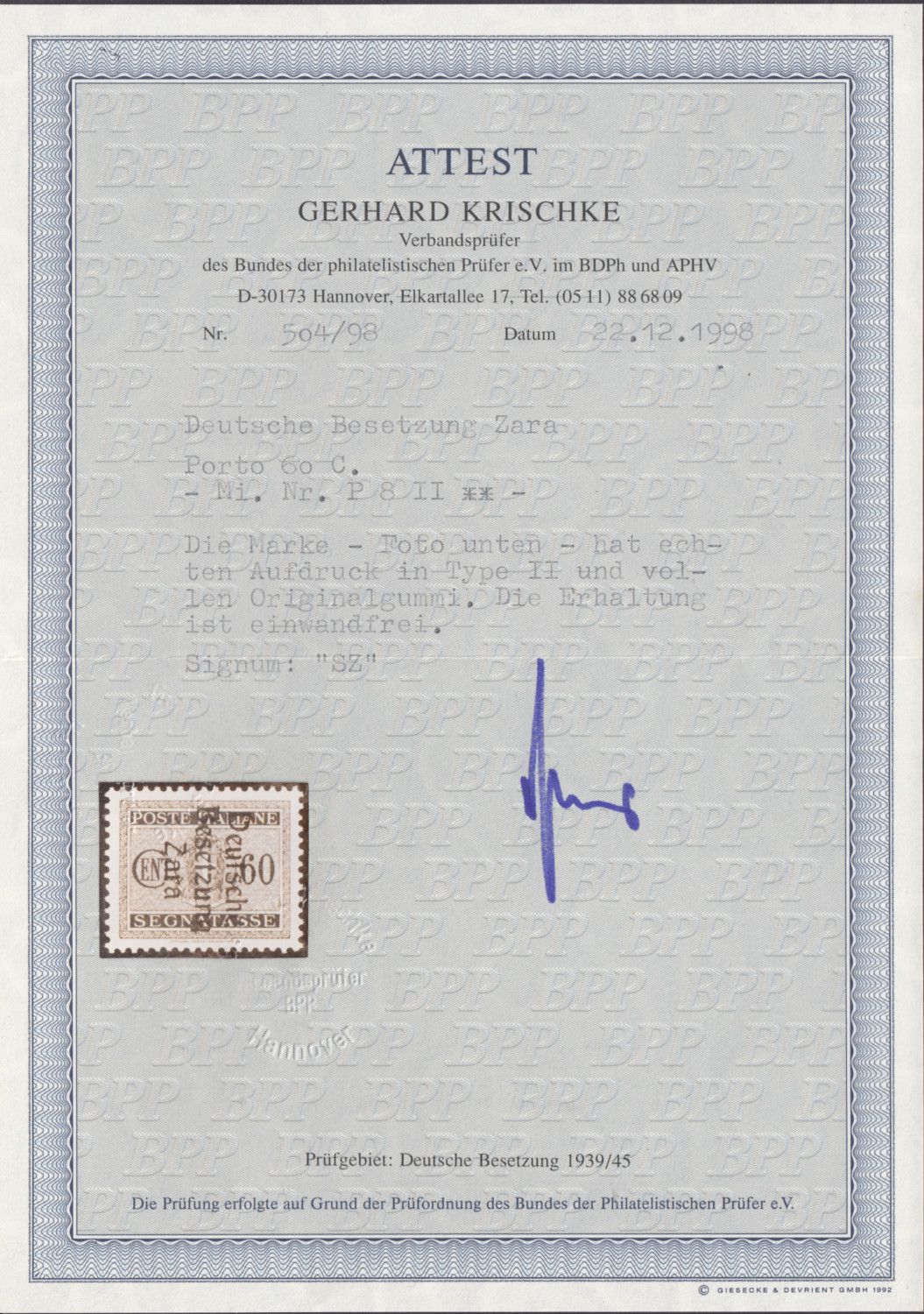 Postfrisch original gummi . geprüft mit Attest  Kriscjke BPP  "echt und einwandfrei "